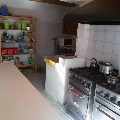 Cocina comunitaria con amplio equipamiento de vajilla e implementos de cocina.